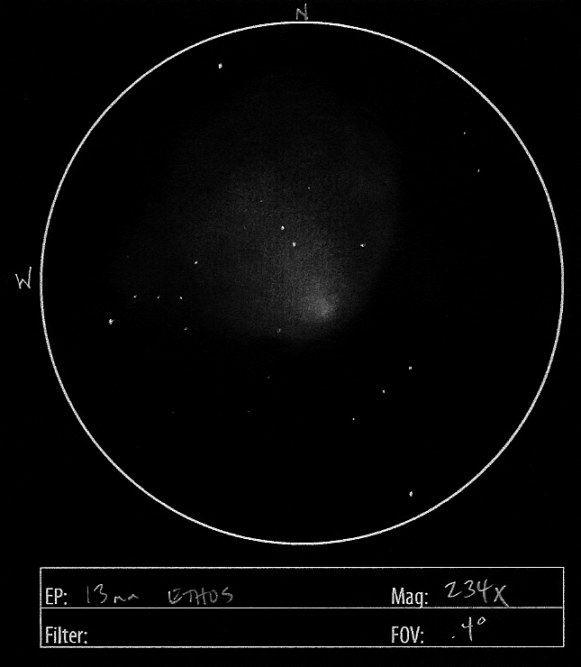 I am only going to post a few of the highlights from my two nights in Portal, beginning with Comet 103P/Hartley. You can read about this comet that I have been observing over the past month in some of my earlier posts. What was amazing was that the comet was visible to the naked eye as a fuzzy spot in the constellation of Cassiopeia. It has brightened considerably and while still diffuse, sports a bright nucleus and extensive coma. The comet is now appearing to move swiftly, approximately 5.8 arceseconds per minute during the time I was making the sketch...that translates to about 2.5 degrees of sky per day! The sketch was made on the night of 10-10-2010 through my LX200 12 inch SCT and a 13mm Ethos eyepiece, yielding a magnification of 234X and a field of view of.4 degrees. The comet's distance from the earth was approximately .142 AU, and its distance from the sun was 1.093 AU (one AU = 93 million miles).