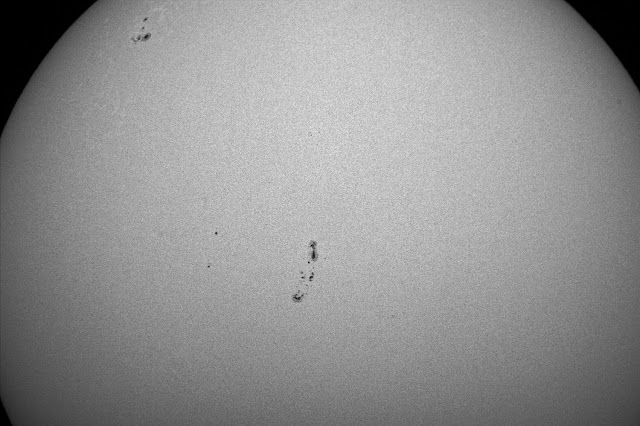 Below is an image of the Sun in white light taken at 1626 UT this morning through my TEC 140 and Lunt Herschel Prism. I am still learning the ropes with Adobe Photoshop and I really need to identify a process that works and stick with it. Overall, the image is not bad, however, I know that if I had a little more patience in both acquiring and processing the image I would end up with better results. I guess that is why as much fun as I have dabbling in astrophotography, I'll always be a visual observer at heart. (Do you hear that Mr. Wiles?) As always, click to enlarge to full size
